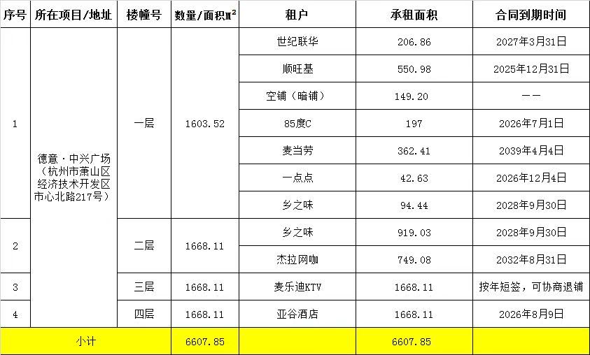 2、租户为麦当劳,一点点,重餐饮,KTV,酒店等业态。目前年租金约645万。