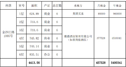 2、1F为美团买菜,年租金96万;2F-6F为如家商旅酒店,共119间房间,年租金501万;共计597万。租期15年。